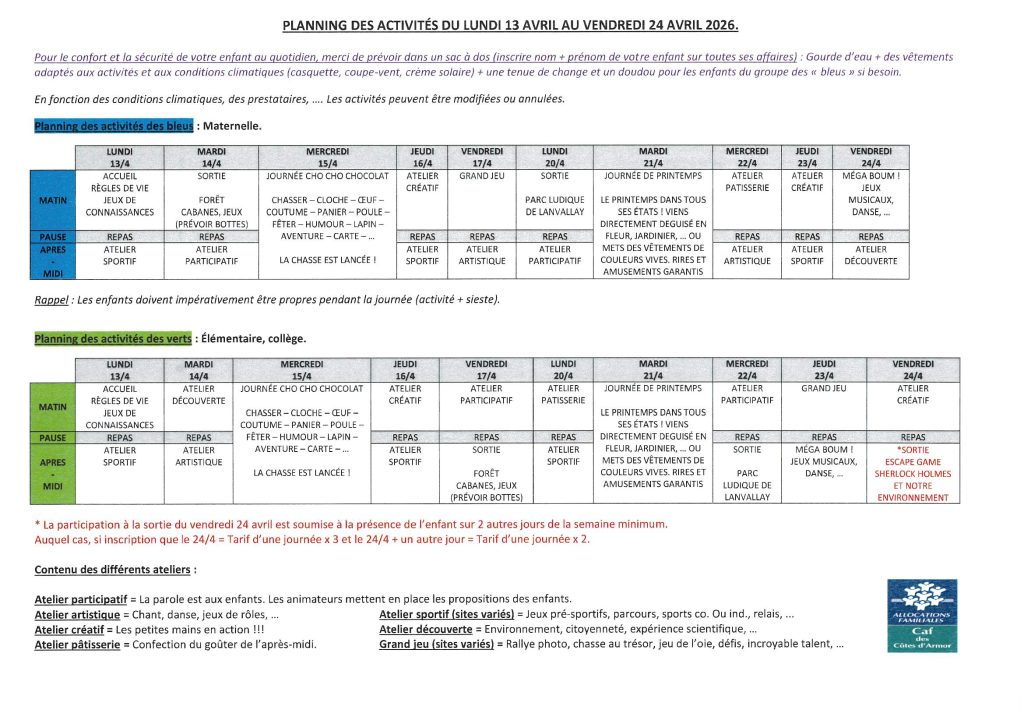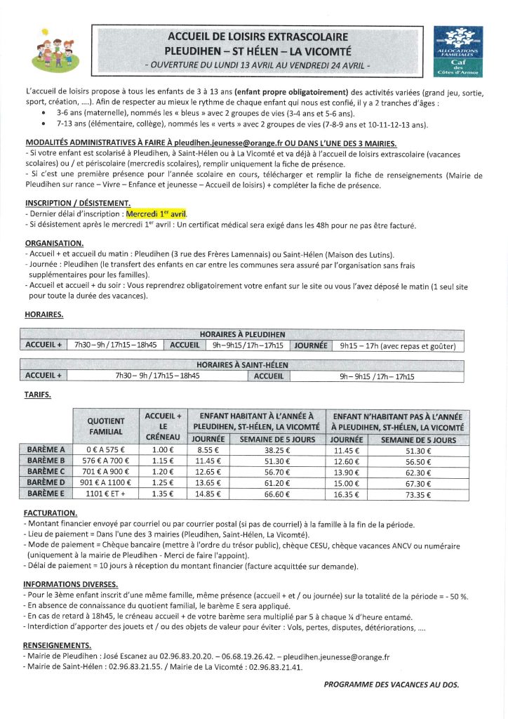ATTENTION : En raison des travaux à l’école publique de Saint-Hélen, l’ALSH se déroulera exceptionnellement sur le site de Pleudihen-sur-Rance pour tous les enfants. Néanmoins, les enfants peuvent être accueillis en garderie du matin et/ou du soir à la Maison des Lutins de Saint-Hélen.