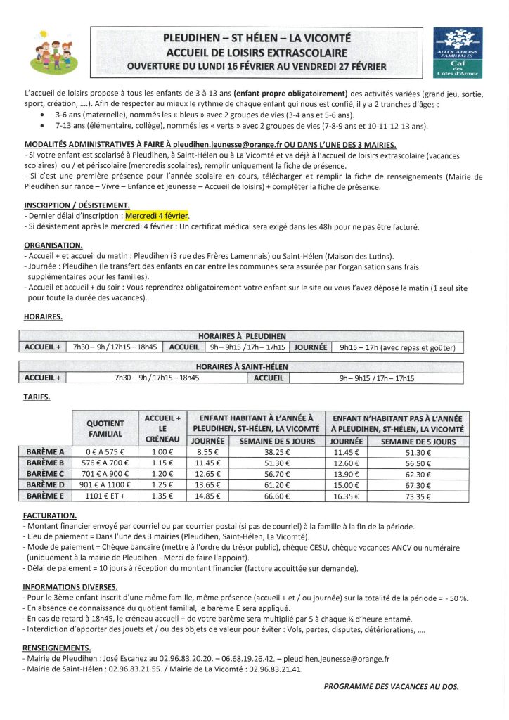 2.45 € le repas pour le 3ème enfant et plus d’une même famille de la commune lorsqu’ils sont tous présents